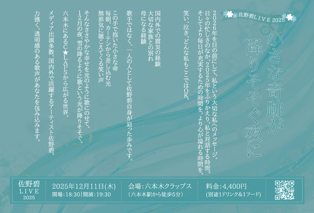 [ライブ入場チケット]2025年12月11日(木) at 六本木クラップス|佐野碧 LIVE2025「小さな奇跡が降りそそぐ夜に」